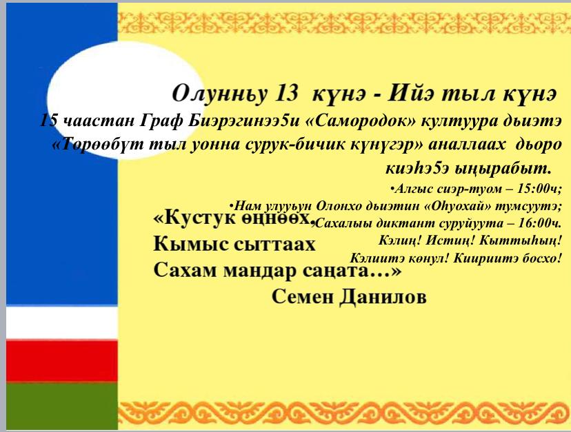 Бугунну уеруулээх Ийэ тылбыт дьоро кунугэр кыттыыны ылбыккытыгар ис сурэхтэн махталбытын биллэрэбит! 👍👏👏👏🙏🙏🙏💐💐💐 Сыл аайы бу утуе кун- Тереебут тыл, сурук-бичик кунэ угэскэ кубулуйан кэнчээри, эдэр ыччакка бэриллэн истин, тереебут терут тылбыт сайда-чэчирии турдун! 👍👏🙏📚📖 Нам улууьун «Оьуохай» тумсуугэ сиртэн-халлаанна диэри махталбытын тириэрдэбит 👍👏🙏🙏🙏😘😘😘🎤🎼эдэр эрчимнээх ыччаппытыгар Намнаа5ы техникум студеннарыгар, преподавателлэригэр, маастардарыгар, воспитателлэригэр, оскуола коллективын учууталларыгар, улэьиттэригэр, чуолаан Саха тылын учууталыгар Надежда Михайловна Дьяконова5а👍👏🙏🌷🌸🌺Граф Биэрэгин олохтоохторугар🌷🌸🌺👍👏🙏А5ам саастаах дьоммутугар 👍👏🙏😘 сцена, спорт ветераныгар Варвара Наумовна Сивцева5а 👍👏🙏😘🌷🌸🌺уонна тэрээьиммитигэр саамай куус-кеме буолбут убаастабыллаах Анна Даниловна Николаева5а 👍👏🙏🙏🙏👏👏👏🌷🌸🌺😘😘😘 Бу курдук биир санааннан тумсуулээх буолуоххайын! 👍👏🙏🙏🙏😘😘😘✊🌷🌸🌺💐💐💐